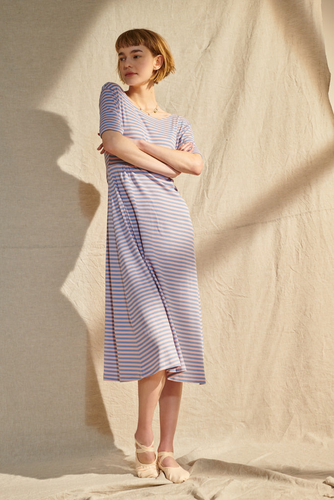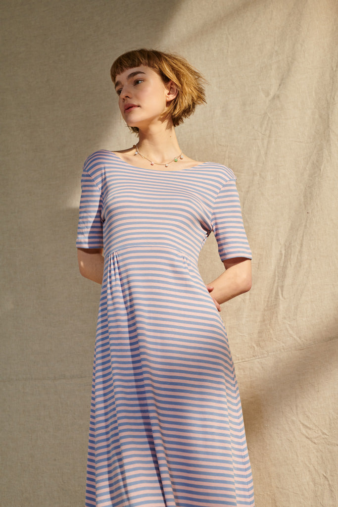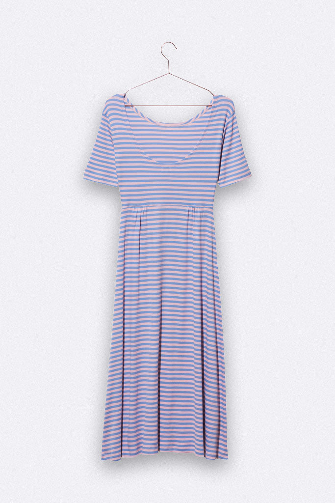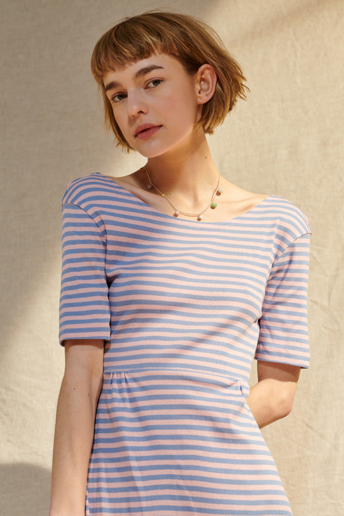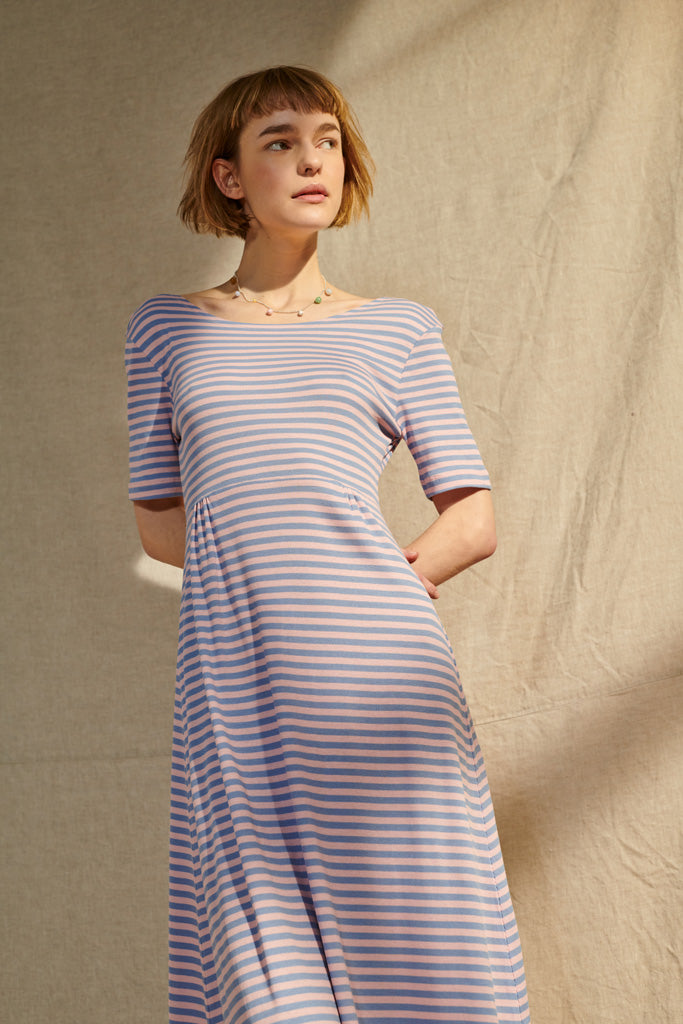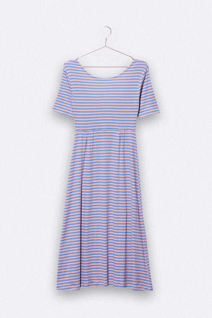 Das Enea Kleid ist ein Midi-Kleid mit tiefem Rückenausschnitt. Es ist aus hellblau/rosa gestreiftem Bio-Baumwoll Ribjersey gefertigt.